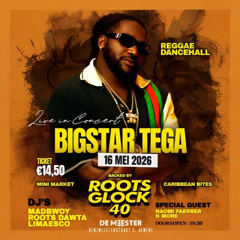 On May 16, 2026, authentic reggae artist Bigstar Tega will take the stage live at Poppodium De Meester in Almere. With his deep Surinamese roots and powerful sound, he brings a unique mix of roots reggae and dancehall.